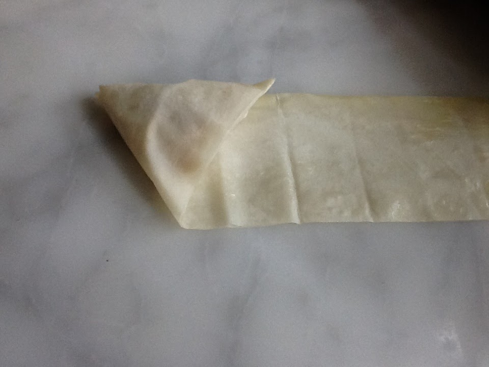 cogemos 2 tiras de las que hemos cortado (sólo dos hojas) y las pincelamos un poco con la mantequilla. En un extremo ponemos una cucharada generosa de relleno y: