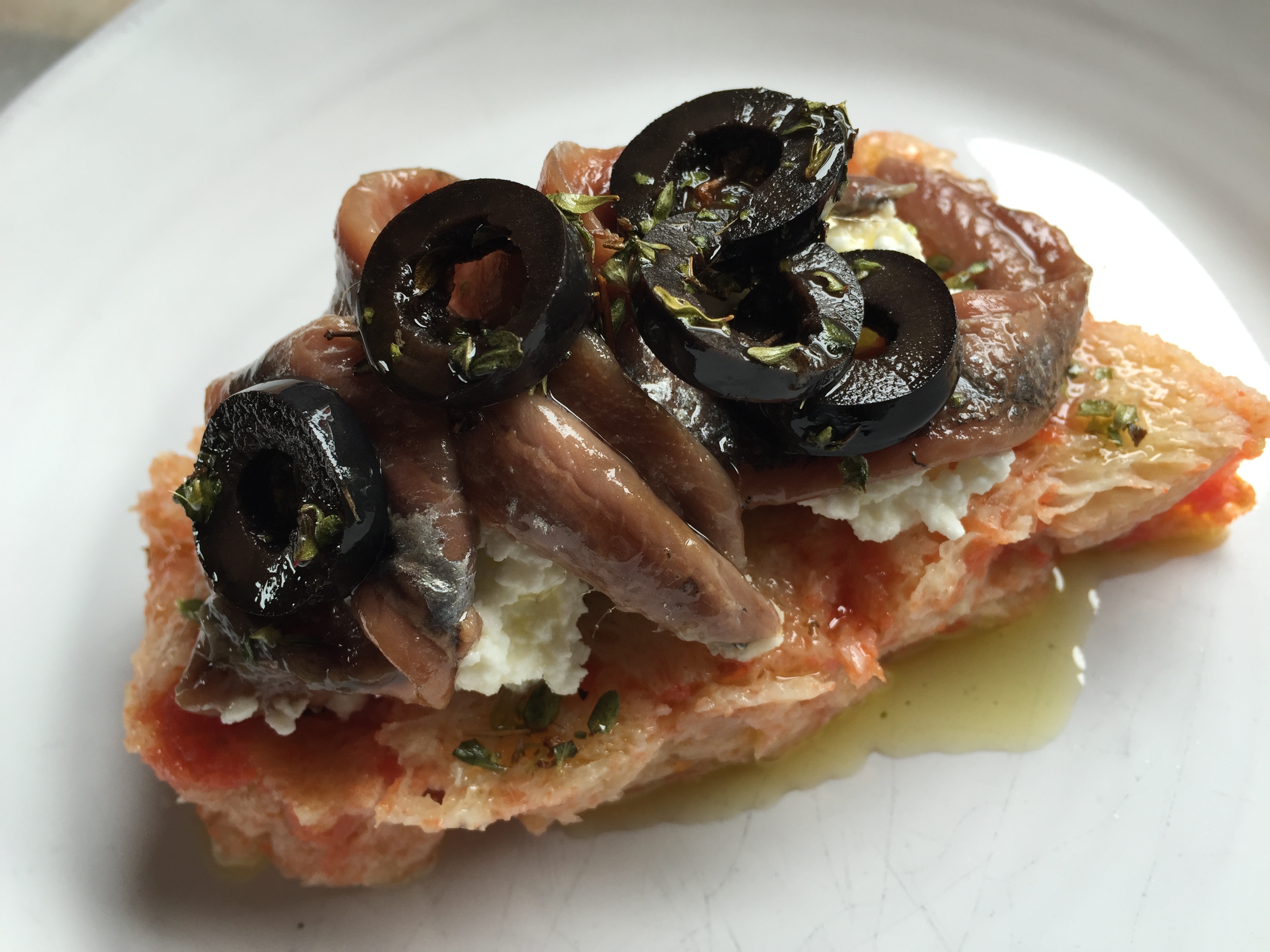 En cada porción colocamos primero una cucharada de mató, encima 2 anchoas y lo rematamos con el aliño de aceitunas y tomillo.