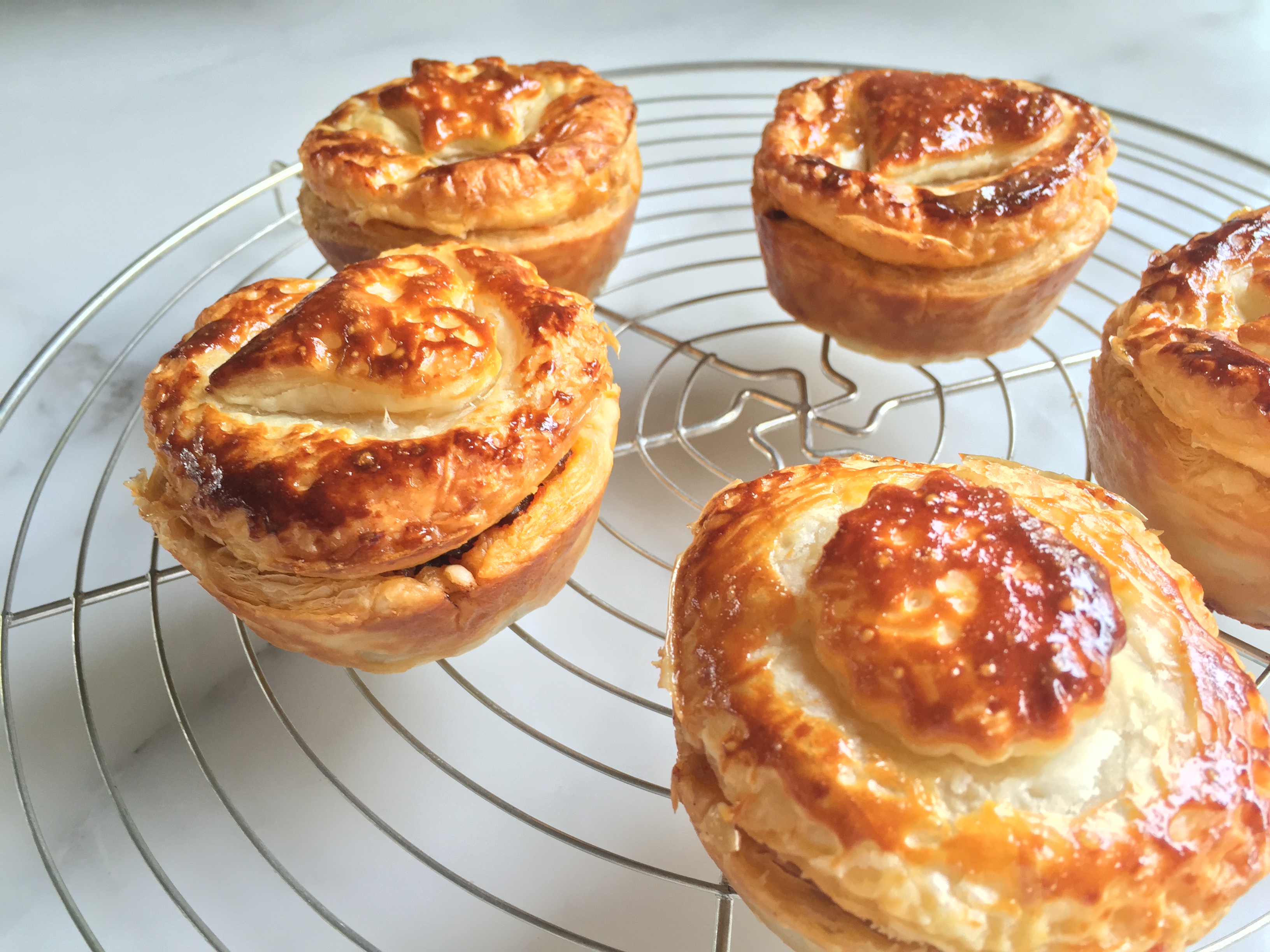 Horneamos durante unos 20 ó 25 minutos, en cuanto las veamos con la tapa un poco infladita y dorada, sacarlas YA! Con el horneado del hojaldre no hay que despistarse y a partir del minuto 20 más vale no quitarle ojo. Las sacamos y las ponemos sobre una rejilla, así favorecemos el resultado crujiente.