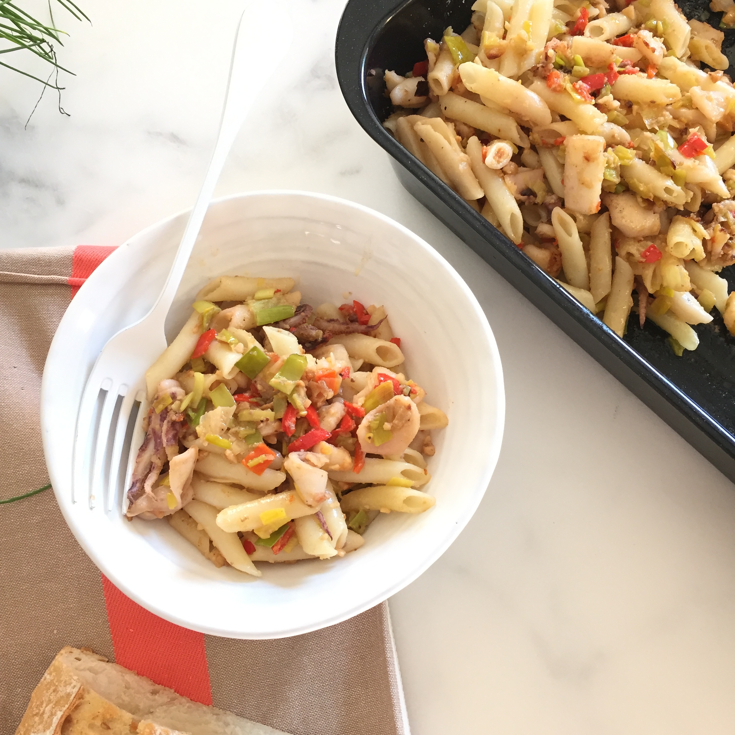 Turno de los calamares. En una cazuela ponemos aceite y cuando esté BIEN caliente echamos los trozos de calamar, salpimentamos y los dejamos 1 minuto. Incorporamos los pimientos, los puerros, los macarrones y las avellanas machacadas. Le damos unas cuantas vueltas con la cuchara de madera y probamos a ver qué tal está de sal.