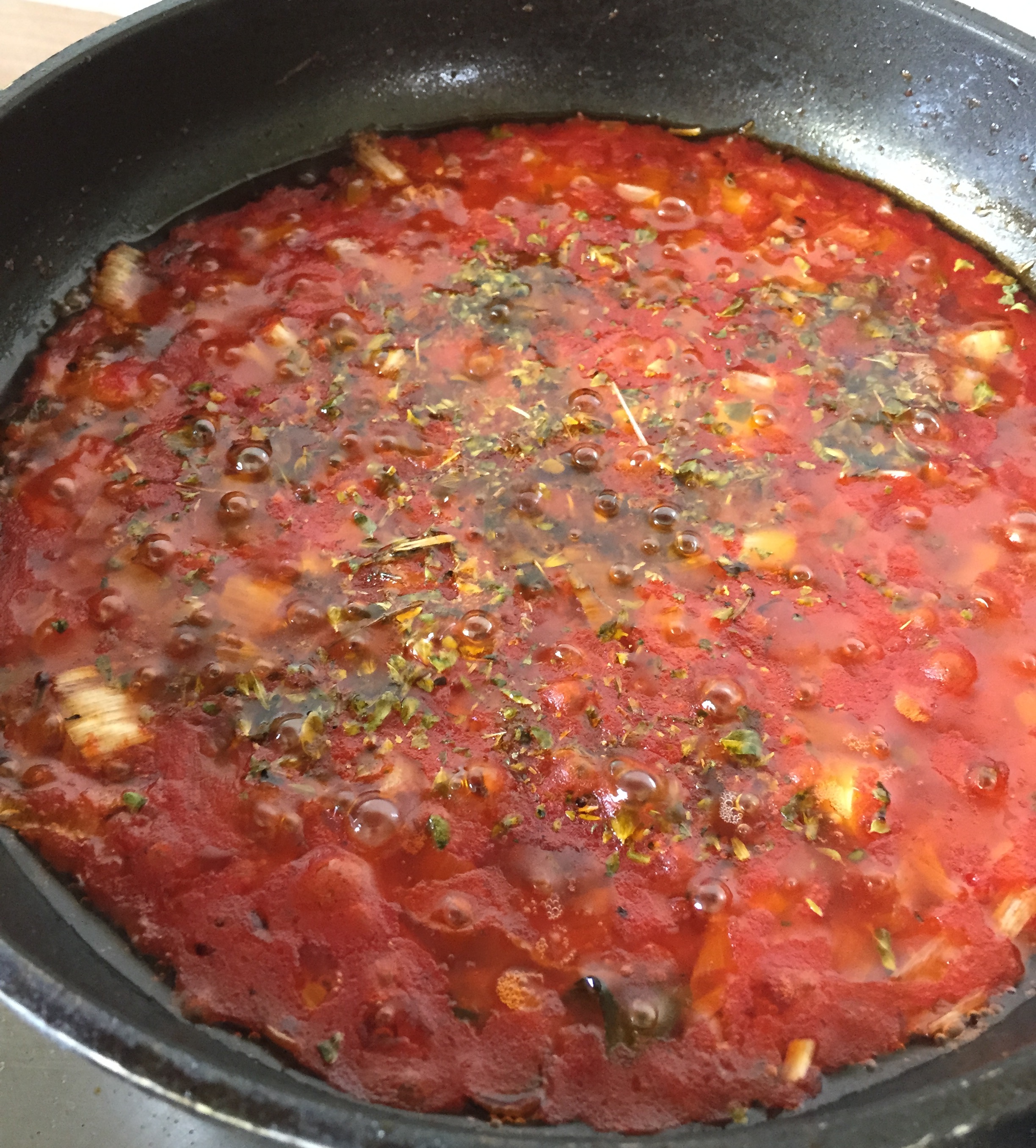 Empezamos preparando la salsa de tomate. En una sartén honda ponemos el aceite suficiente para rehogar a fuego lento el puerro picado finamente. Cuando esté ligeramente dorado (cuidadín que el puerro pasa de dorado a quemado en 0,5 segundos) añadimos el tomate, las hierbas, el diente de ajo picado, el azúcar, la sal y la pimienta. Subimos la temperatura del fuego, para que el tomate se fría, y cuando empiece a salpicar tapamos parcialmente. Aflojamos el fuego y dejamos que el tomate se vaya haciendo durante unos 20 minutos aproximadamente.