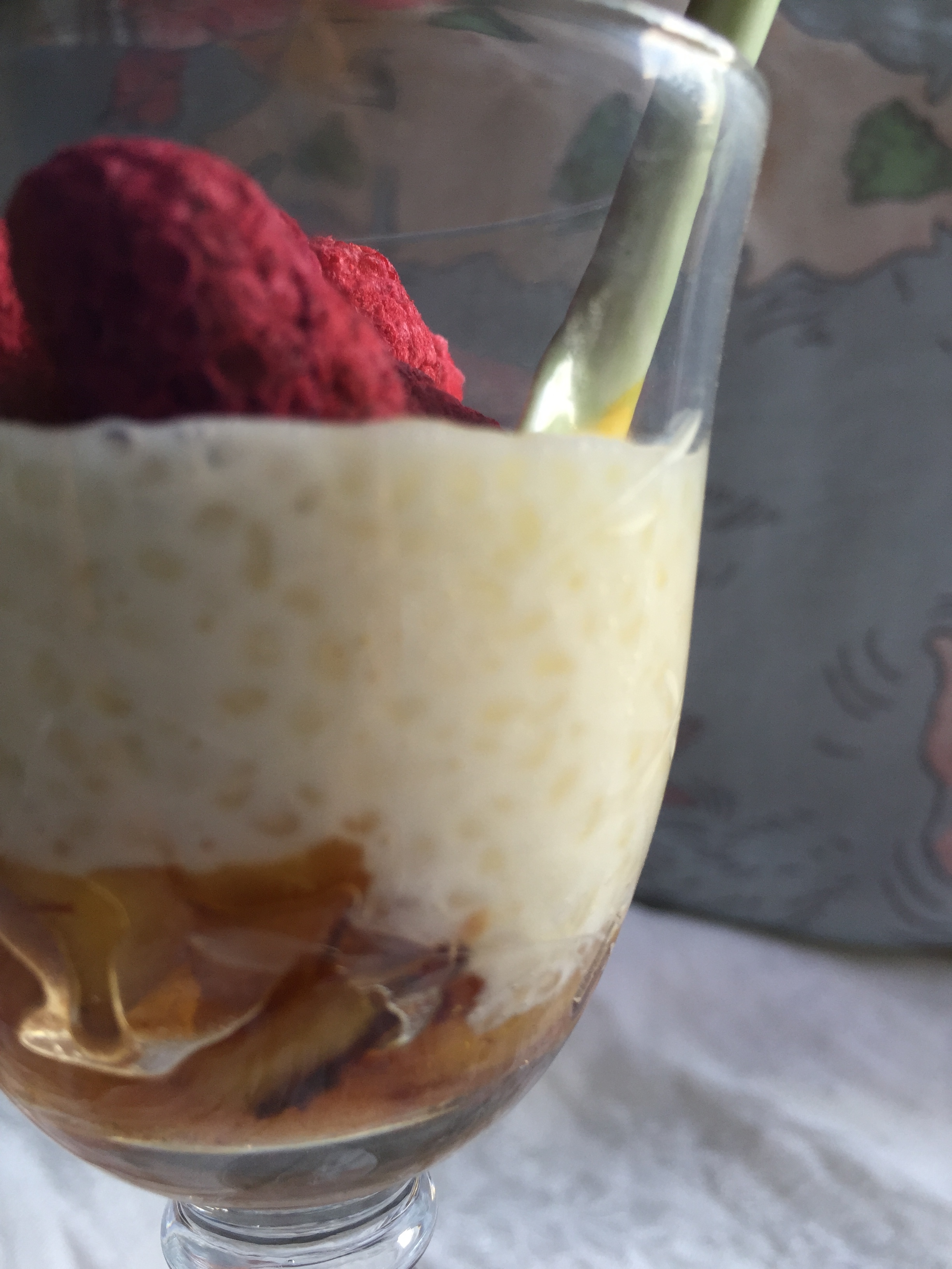 En unas copas o vasitos de cristal colocamos en el fondo la manzana caramelizada (lo mejor es poner hasta la mitad), la tapamos con unas cucharadas de tapioca. Rematamos con las frambuesas o lo que queráis poner. Otra opción distinta a las frutas sería la de espolvorear azúcar por encima de la tapioca y tostarlo con un soplete. Así, tenemos un poco de contraste frío-calor que siempre queda resultón, y más cuando no tenemos ni fresas ni frambuesas ni… ni nada.