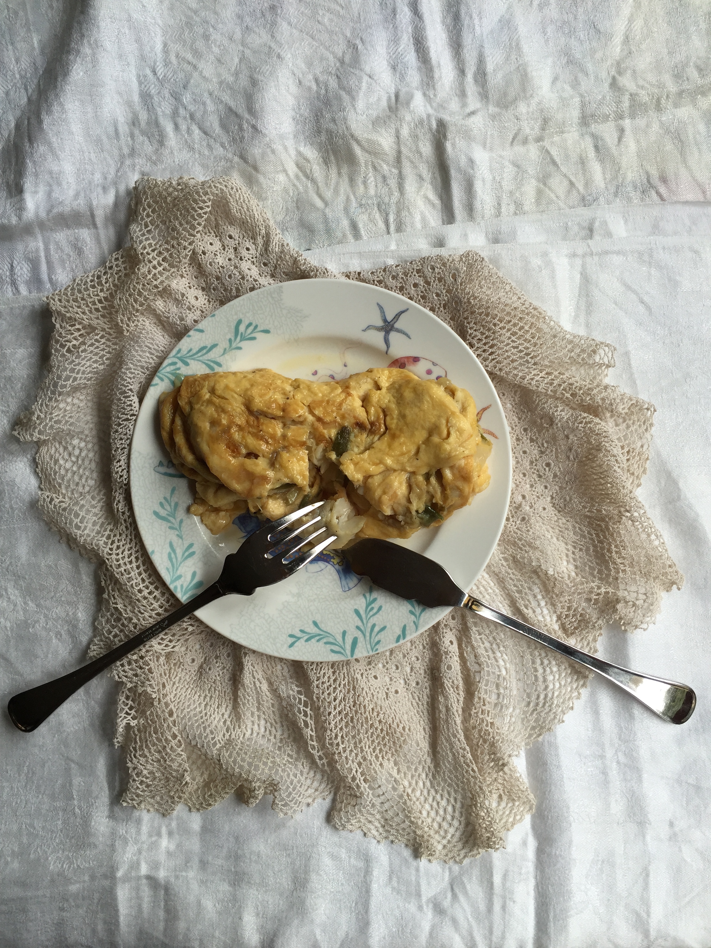 Los incorporamos a la sartén, subimos el fuego. Espolvoreamos el perejil. Removemos, un par de vueltas es suficiente. Aflojamos el fuego, que se cuajen un poco los huevos y empezamos a plegar los bordes como cuando hacemos tortilla a la francesa. Ideal que nos quede doradita por fuera y jugosa por dentro. Ni bien la saquemos de la sartén, ya está lista para que en la mesa vayan descorchando la botella de sagardo.